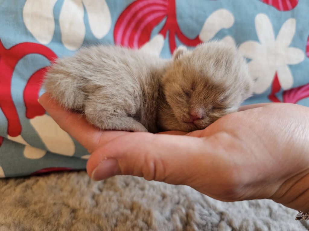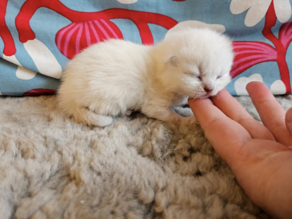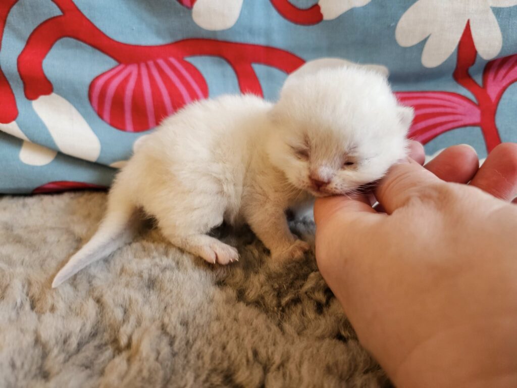 Märtas och Frostys kull har nu hunnit bli en vecka och de växer så det knakar. En av dem har börjat öppna ögonen och snart är nog de andra två också på G. Det är tre grabbar, en lila och två maskade/colourpoint, varav en är lite mörkare och en lite ljusare så min gissning är att en är lila och en blå men tiden får utvisa 🙂